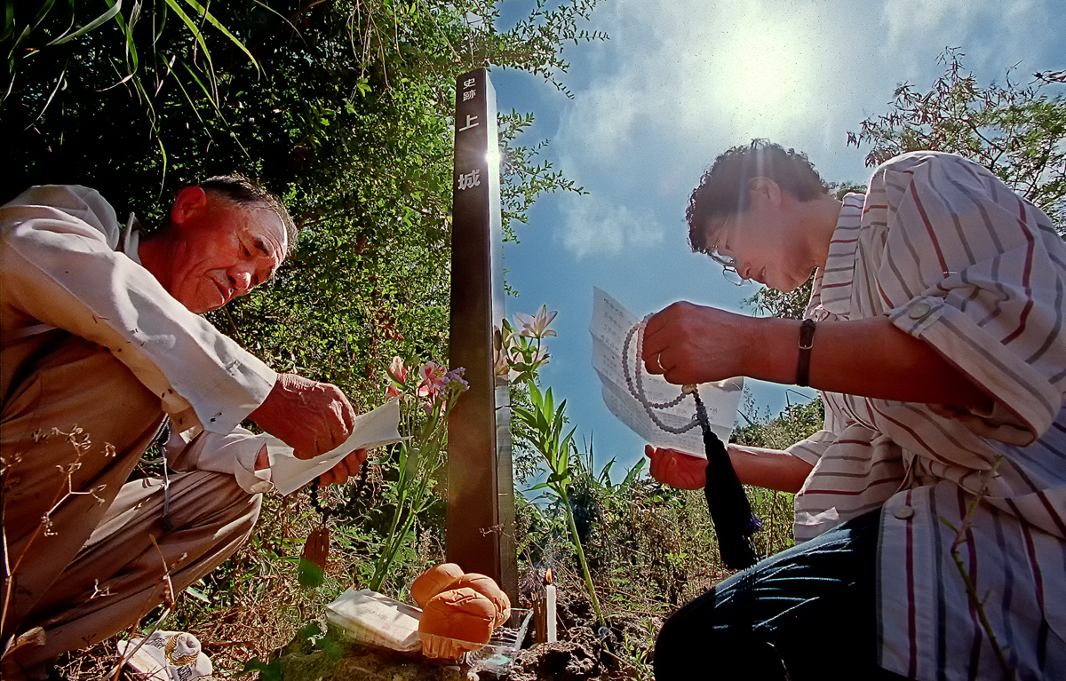 兄の戦死公報に記されていた地名の標識の下で、慰霊の祈りを捧げる徳男さんと富美子さん。この標識を墓標代わりにしている、沖縄本島南部の旧具志頭村で
